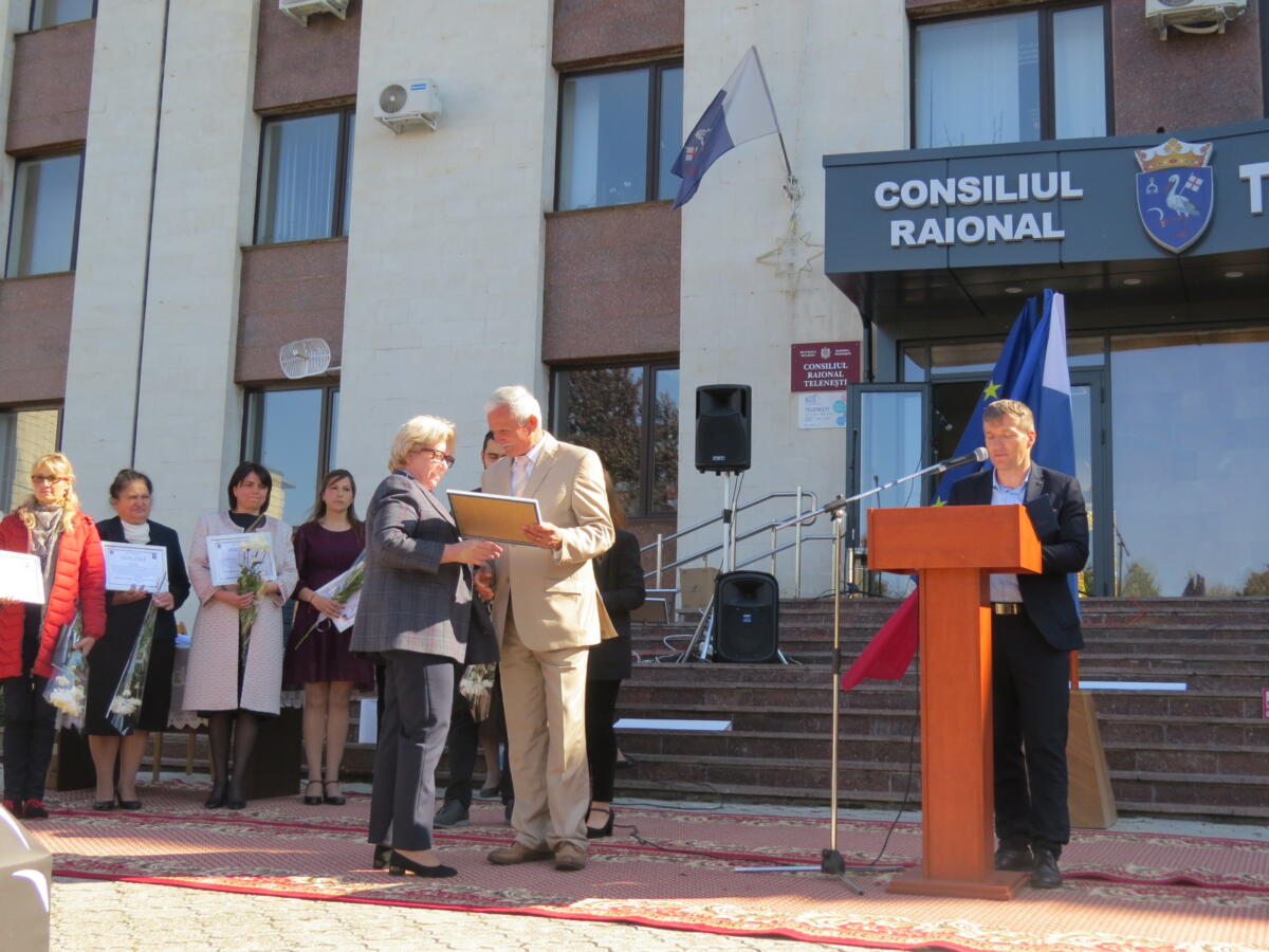 Printre toate mesajele de felicitare și gratitudine care au răsunat din scenă pentru scumpii dascăli, vicepreședintele raionului s-a alăturat cu un mesaj adresat tuturor cadrelor didactice din raionul Telenești, ”În această zi frumoasă de toamnă celebrăm dascălii din toată lumea, cu scopul de a asigura îndeplinirea nevoilor educaţionale ale tuturor şcolarilor şi de a mobiliza sprijinul pentru profesori. Cu această ocazie vin cu alese cuvinte de stimă, recunoştinţă şi admiraţie, frumoase urări de bine, sănătate, prosperitate către Dumneavoastră, dragi dascăli sfătoşi şi mărinimoși din raionul Telenești. Astăzi atenția se îndreaptă spre profesori, învăţători, dascăli, educatori, spre oamenii care trudesc cu abnegaţie pe făgaşul cultivării seminţelor cunoștințelor. Vă mulţumim că sunteţi în domeniul educației şi Vă articulaţi activitatea profesională în consens cu aspiraţiile spre un învățământ performant. Învăţătorii, prin dăruirea şi priceperea lor, pun în lumină talentul şi cunoaşterea celor mici. Ca personalitate de referință, profesorul va reprezenta, mereu, termenul de comparaţie valoros, demn de urmat, capabil de autodepăşire.